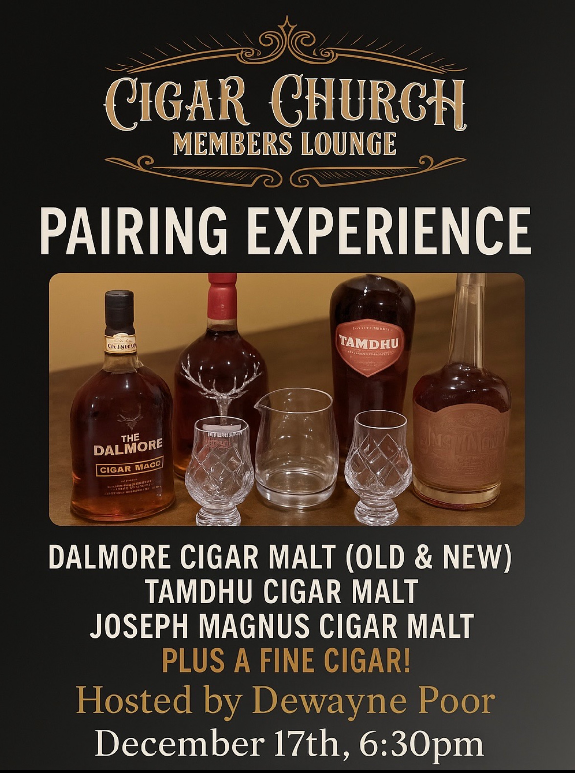 Join us for an exclusive evening of refined taste and fellowship at Cigar Church. This Pairing Experience, hosted by Dewayne Poor, will feature a curated lineup of exceptional cigar malts — including Dalmore Cigar Malt (Old & New), Tamdhu Cigar Malt, and Joseph Magnus Cigar Malt — each paired perfectly with a fine cigar.